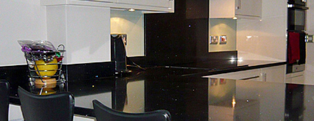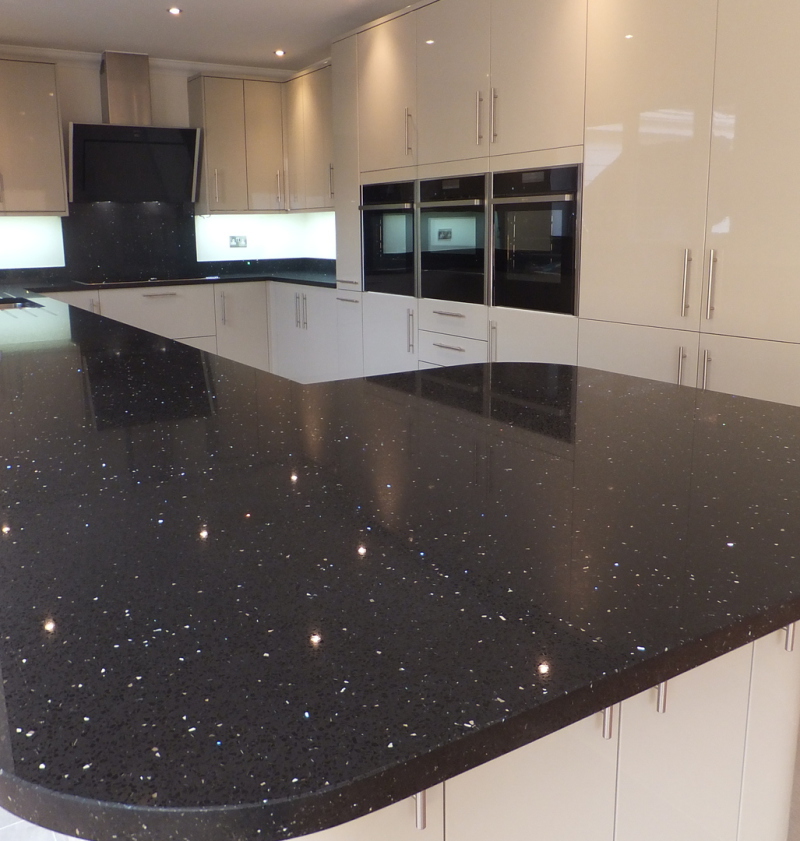 Starlight quartz is an all time, firm favorite in the Quartz world.With an inky black back drop, the generously scattered mirror chips promise to make your kitchen look out of this world.